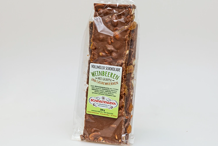 Vollmilchschokolade Weinbeeren in Grappa und Cashewkerne